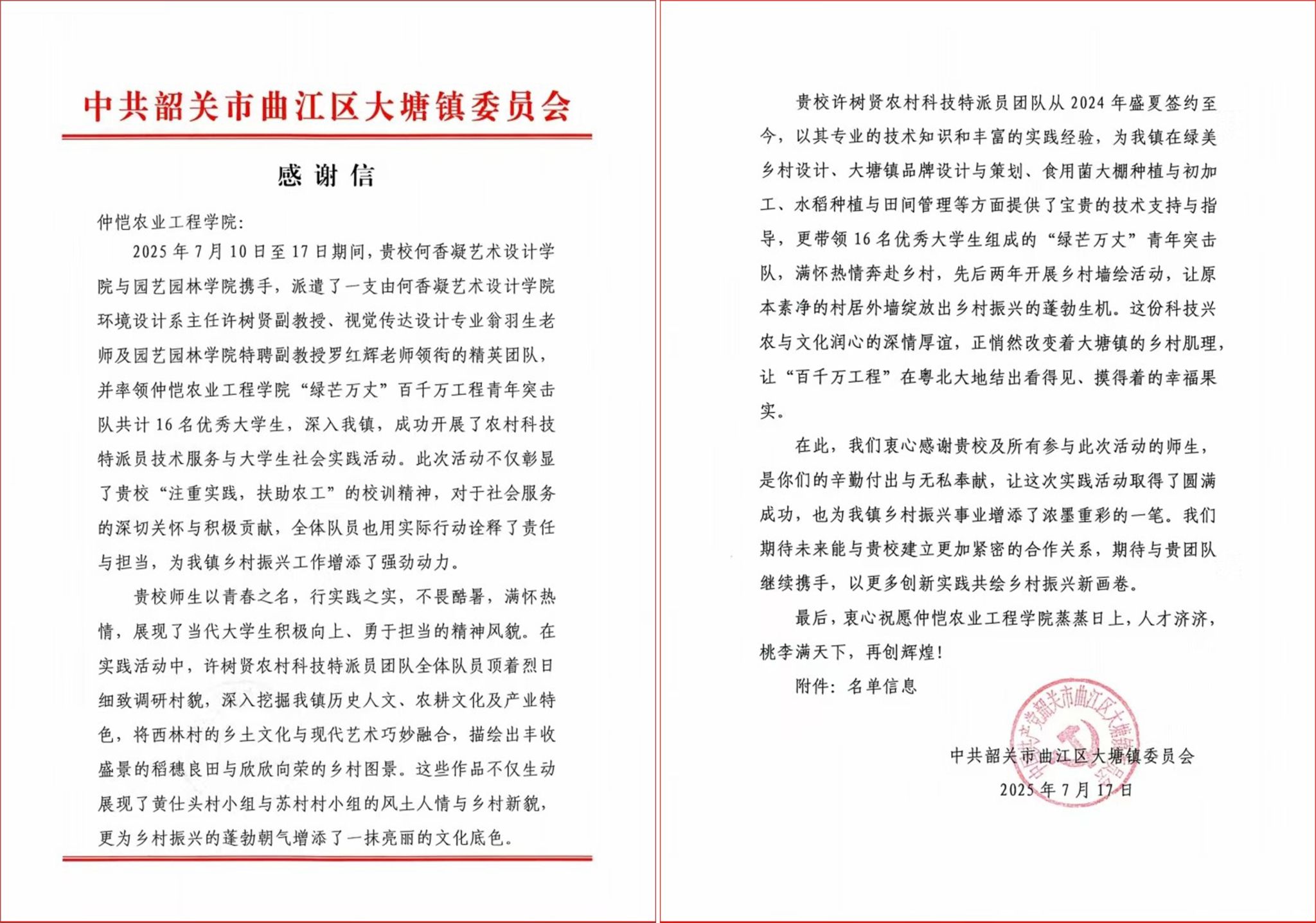 本次下乡实践成效显著,获得大塘镇人民政府及村民高度认可。活动充分彰显了科技与艺术融合在乡村振兴中的强大驱动力,在村民心中深植科技兴农、文化润心的种子,为大塘镇深入实施乡村振兴战略提供了“仲恺样板”。大塘镇政府特致信感谢,热切期盼未来深化校地共建,汇聚更大合力,持续为“百千万工程”高质量发展注入澎湃动能!