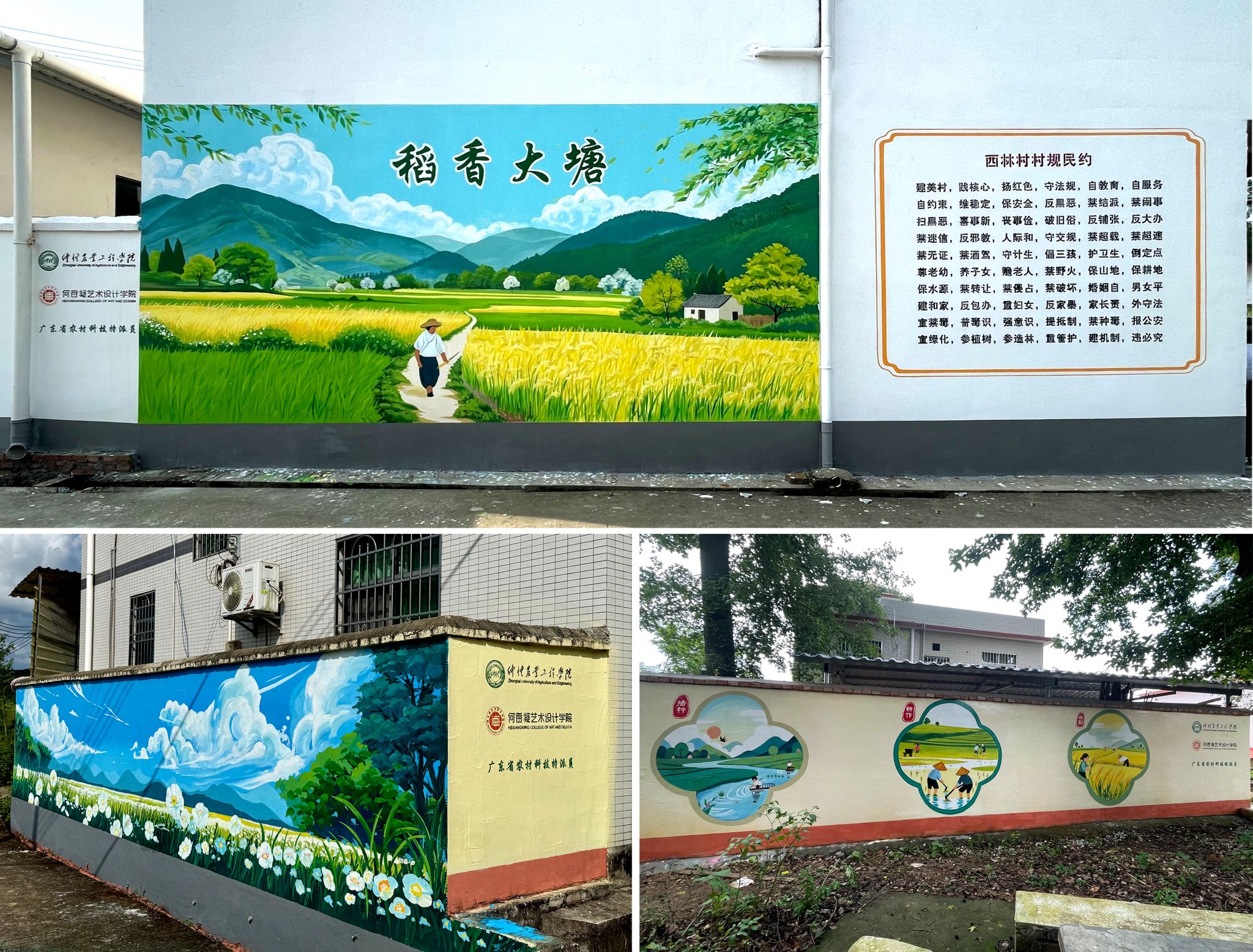 在三下乡实践活动中,我校师生以青春之名,行实践之实,不畏酷暑,满怀热情,展现了当代大学生积极向上、勇于担当的精神风貌。仲恺“绿芒万丈”突击队深入挖掘大塘历史人文、农耕文化及产业特色,将西林村的乡土风情巧妙融入现代艺术中。他们挥汗如雨,历时8天,在黄仕头及苏村村小组创作完成6幅主题鲜明的大型墙绘,总面积达265平方米。画面生动展现了稻穗飘香的丰收盛景与欣欣向荣的乡村新貌,为古朴村落注入蓬勃的文化活力,成为“百千万工程”最亮眼的视觉注脚。同时,实践团队还扎根大塘镇田间地头,挥汗助力花生抢收,在躬身实践中体悟农情,于最朴实的劳作中锤炼品格,以青春担当践行助农使命。