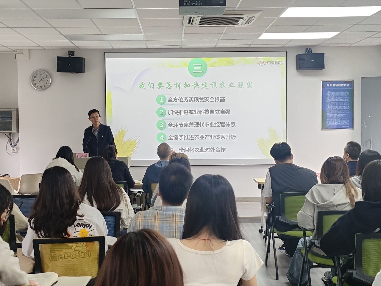 党课伊始,朱立学系统阐释了农业强国建设的时代意义,强调农业强国建设是党中央立足国情、着眼全局作出的重大战略部署。从“满足人民美好生活需要”到“筑牢国家安全根基”,从“支撑高质量发展”到“促进共同富裕”,农业不仅是民生之本,更是国家发展的战略基石。他通过一组数据对比——我国日均消费粮食70万吨、肉蛋奶超千万吨,而耕地仅占全球9%的现实国情,深刻阐明“中国人的饭碗必须牢牢端在自己手中”的紧迫性。结合北大荒航化作业、宁夏稻田艺术等生动案例,他强调农业不仅是基础产业,更是融合生态、文化、休闲功能的综合载体,为乡村振兴指明多元化发展方向。