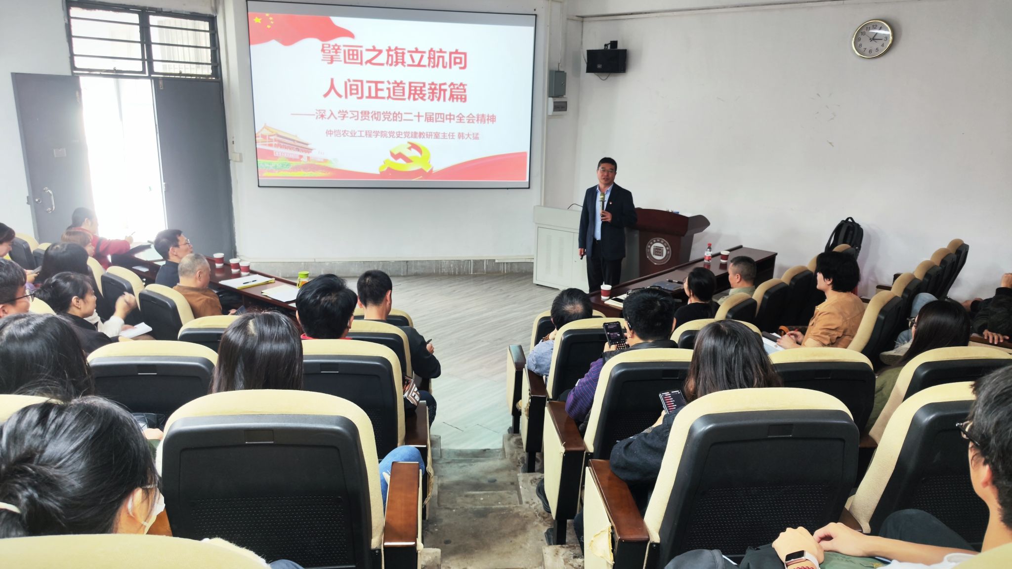 首先,学院党委邀请学校党史党建教研室主任韩大猛副教授作《擘画之旗立航向 人间正道展新篇——深入学习贯彻党的二十届四中全会精神》专题辅导报告。韩副教授围绕全会的重要意义、“十四五”时期国家发展取得的重大成就、“十五五”规划的战略定位与目标任务等进行了系统阐述,并结合教育实际与设计学科特点,重点剖析了发展新质生产力、推动文化创新、统筹安全与发展等议题,为学院下一步围绕国家战略开展育人与创新工作提供了清晰的思路指引。