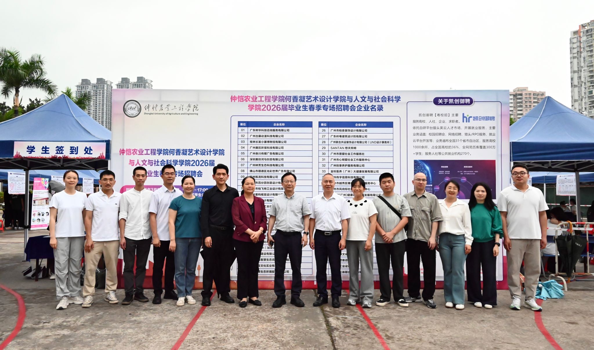 为深入贯彻党中央 “稳就业”“保就业” 决策部署,精准对接2026届毕业生求职需求与用人单位人才需求,3月29日下午,由仲恺农业工程学院就业指导中心主办,何香凝艺术设计学院与人文与社会科学学院联合承办的2026届毕业生春季专场招聘会在海珠校区南区学生公寓篮球场成功举办。