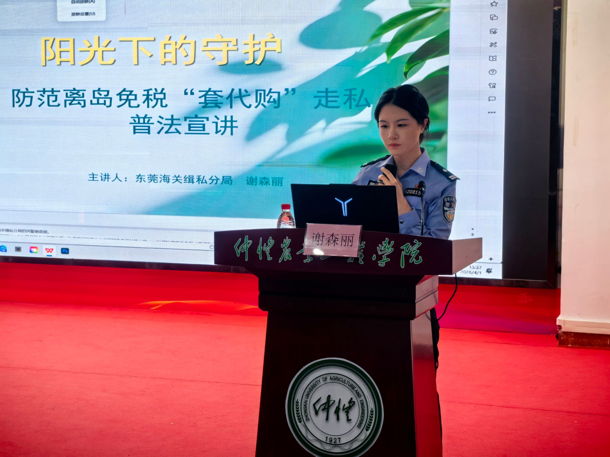 在普法宣讲环节,东莞海关缉私分局两位民警围绕与学生密切相关的走私风险点进行了深入讲解。民警左扬以“防范跨境电商走私”为主题,结合典型案例,剖析了跨境电商领域中常见的伪报、瞒报、刷单等走私手段及其法律后果。民警谢森丽则聚焦“防范离岛免税‘套代购’走私”,详细解读了离岛免税政策的合法使用边界,警示同学们切勿因贪图小利参与“套代购”违法行为。宣讲结束后,主讲人还就同学们提出的法律疑问进行了现场答疑。