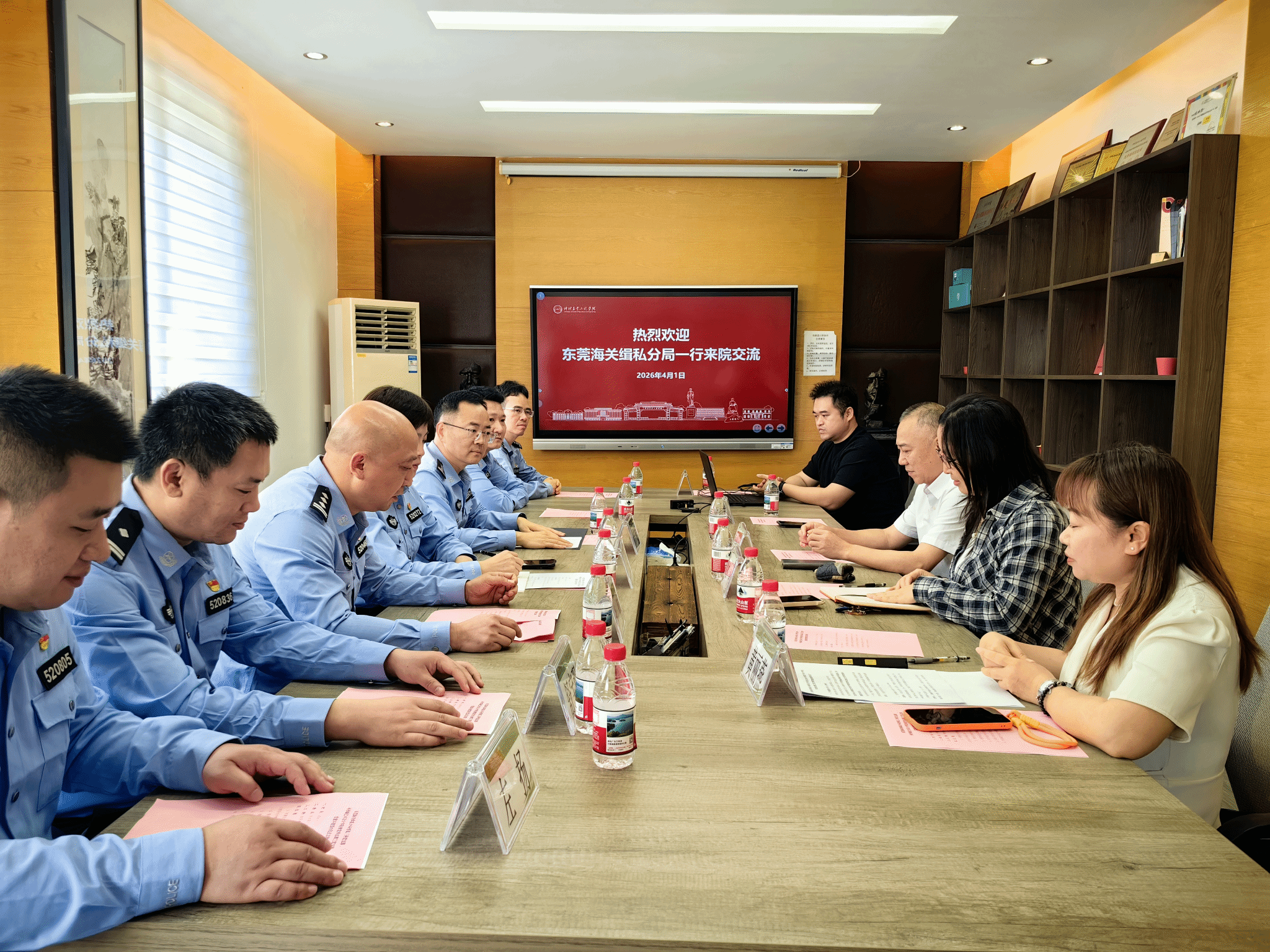 随后,共建双方党支部书记分别介绍了各自党支部的基本情况和党建工作特色。全体人员共同观看了东莞海关缉私分局党总支宣传视频,深入了解分局党建工作成果。视觉传达设计专业教工党支部支委翁羽生老师详细介绍了共建活动计划,明确了未来在组织建设、党员教育、普法宣传、艺术服务法治等方面的合作内容。